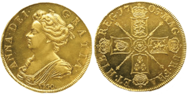 The new gold Five ‘Guineas’ coinage derives its name from the reason that some of the gold was imported from Guinea by The Royal Africa Company founded by King Charles II in 1660. It was valued at 100 shillings and was the largest denomination of a new gold coinage series including the Two Guinea, Guinea and the Half-Guinea at 40s, 20s and 10s.